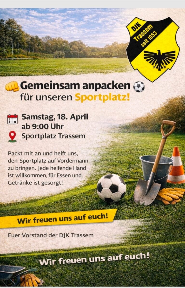 am Samstag, den 18. April, ab 9:00 Uhr möchten wir gemeinsam unseren Sportplatz auf Vordermann bringen – und dafür brauchen wir euch!